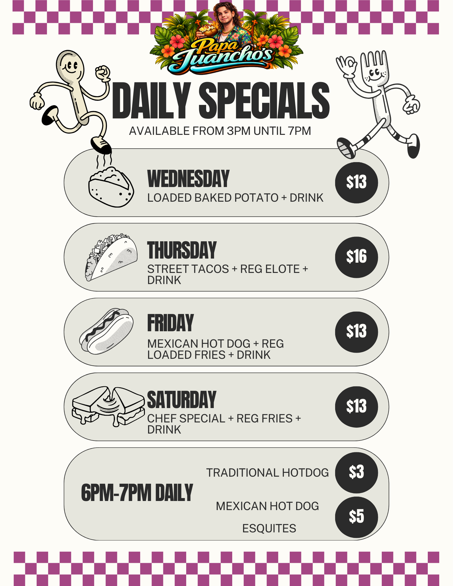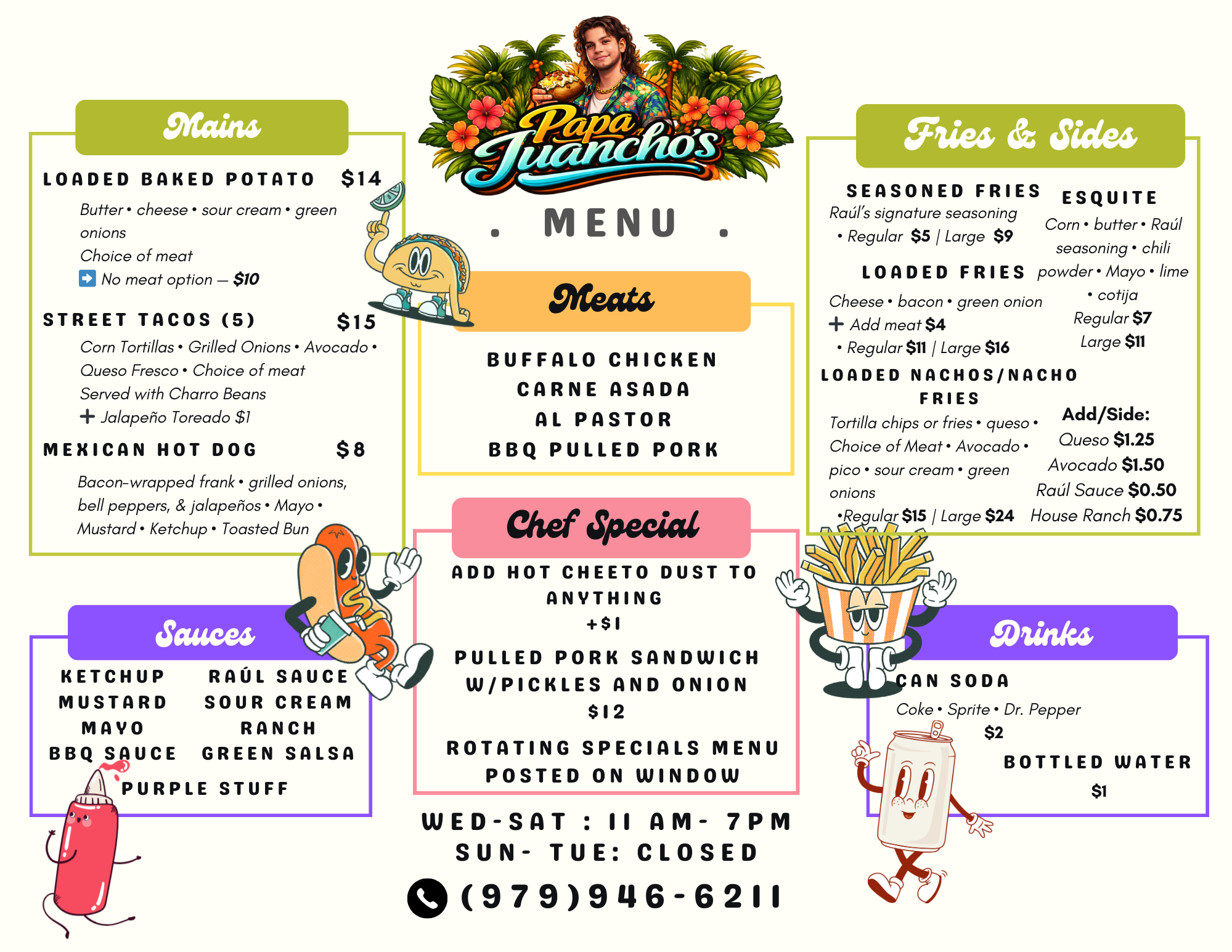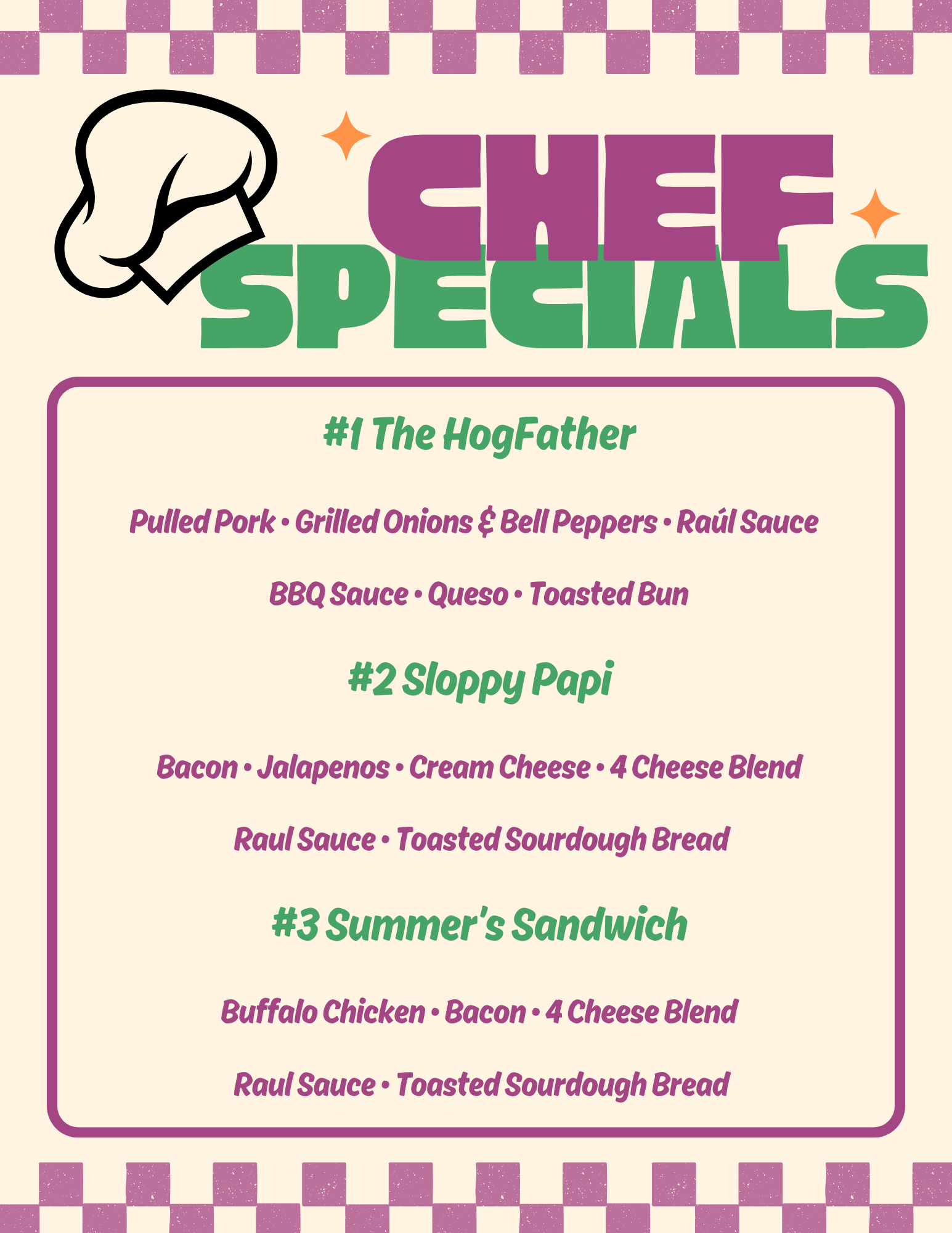 Papa Juancho’s started because I love feeding people and making them smile—sometimes with food, sometimes with unhinged specials, sometimes with both. Some days I’m slinging plates like a machine, other days I’m reminding myself I’m not in my 20s anymore. Either way, the goal never changes: make damn good food and have fun doing it.